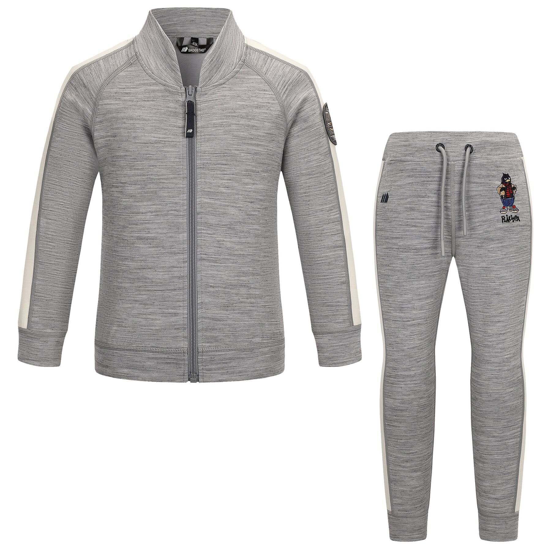 Jakken har en rett modell med krage og en synlig glidelås i front. Buksen har en elastisk linning med snorstramming som gir fleksibel passform og støtter bevegelsesfrihet. Yttersiden består av 100 % mulesingfri merinoull, kjent for sine naturlige isolerende og varmeregulerende egenskaper. Merinoullen holder barnet varmt i kjølige temperaturer, samtidig som den tilpasser seg kroppens behov. Innsiden er laget av bambusviskose som gir en ekstra myk følelse. Bambusviskosen har en naturlig antibakteriell effekt og trekker fuktighet bort fra huden, uten at plagget kjennes vått.