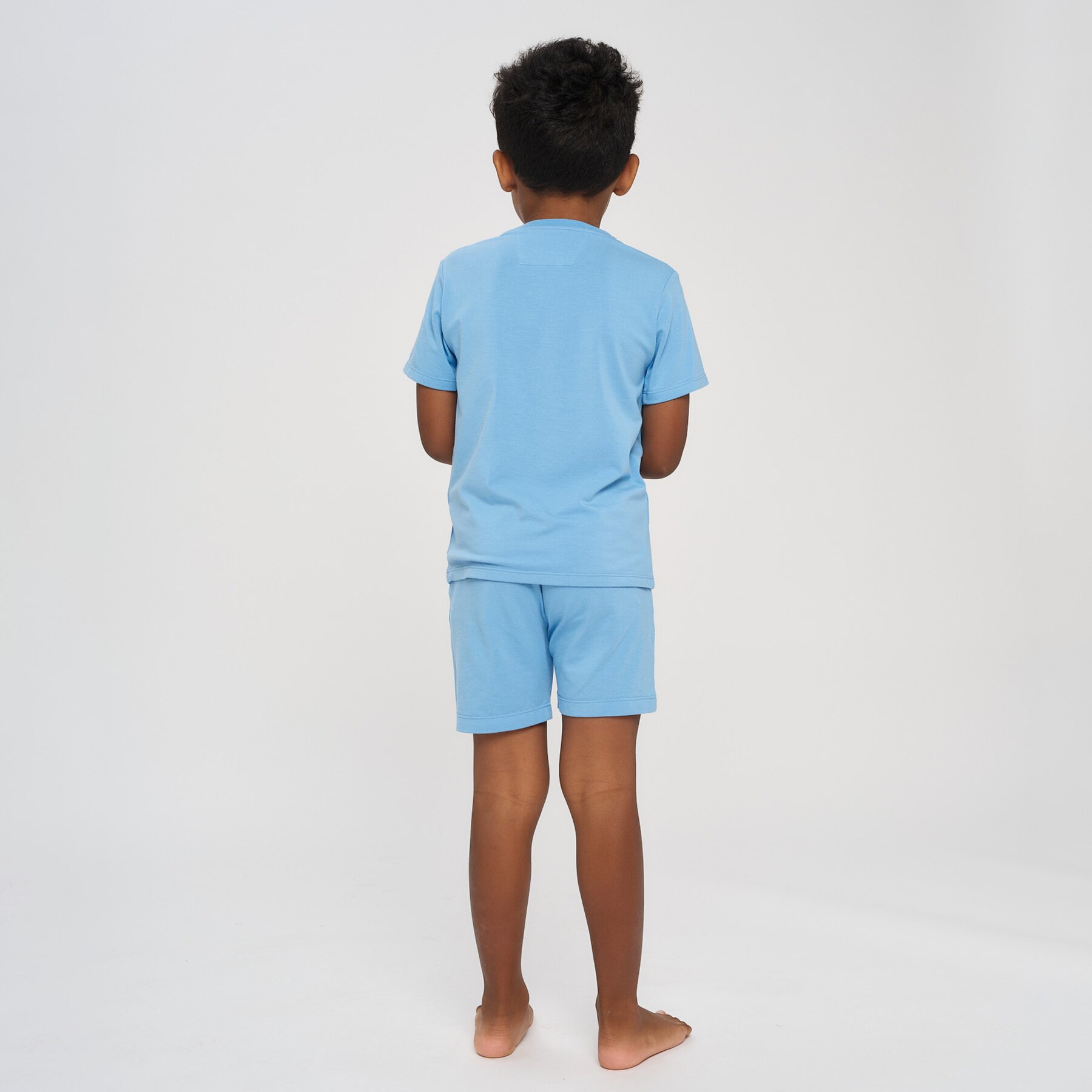 T-skjorte og shorts laget i en blanding av 65 % bambusviskose, 29 % økologisk bomull og 6 % elastan – som gir en utrolig myk følelse mot huden, samtidig som det er pustende, hurtigtørkende og fleksibelt.